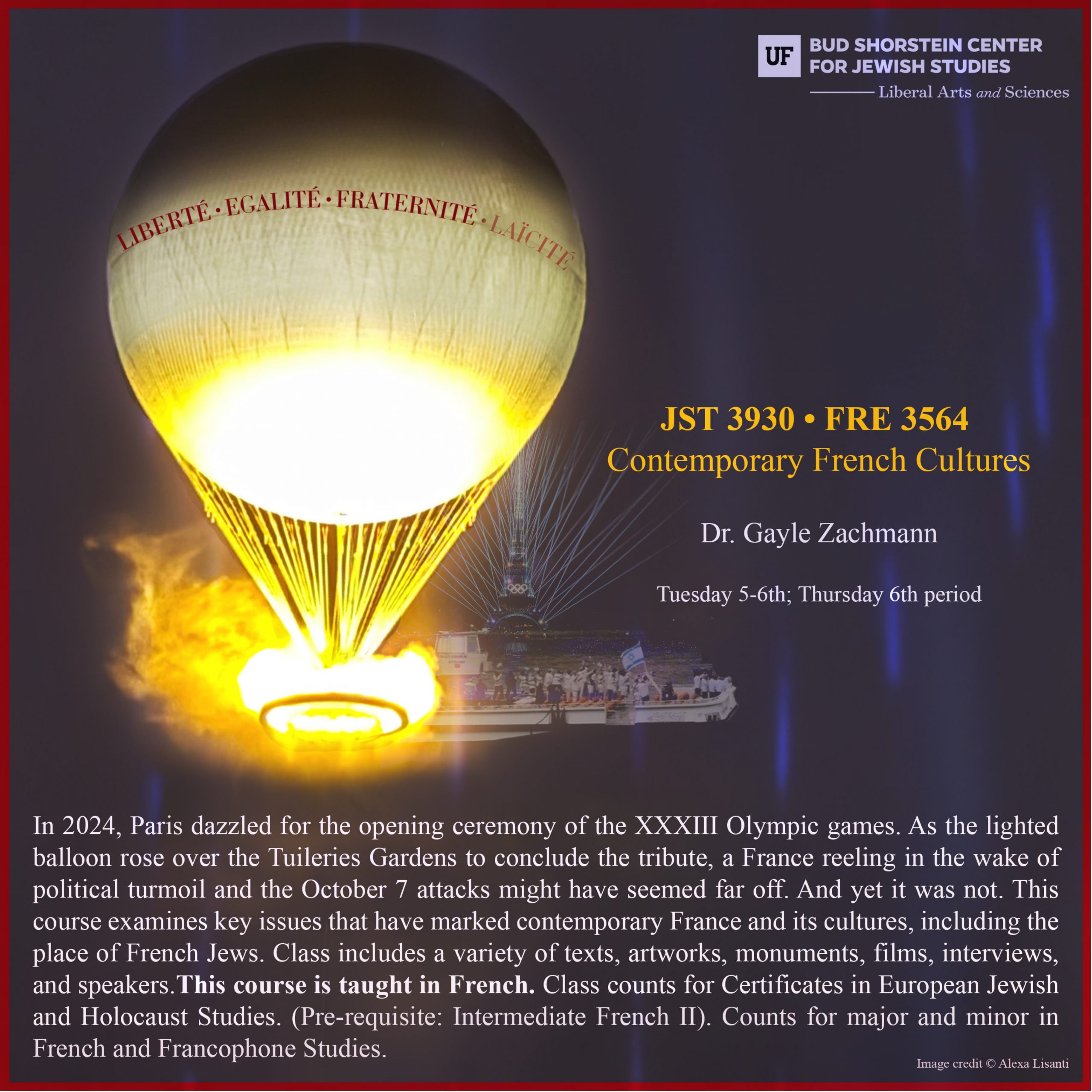 In 2024, Paris dazzled for the opening ceremony of the XXXIII Olympic games. As the lighted balloon rose over the Tuileries Gardens to conclude the tribute, a France reeling in the wake of political turmoil and the October 7 attacks may have seemed far off. And yet it was not. This course examines key issues that have marked contemporary France and its cultures, including the place of French Jews. Class includes a variety of texts, artworks, monuments, films, interviews, and speakers. This course is taught in French